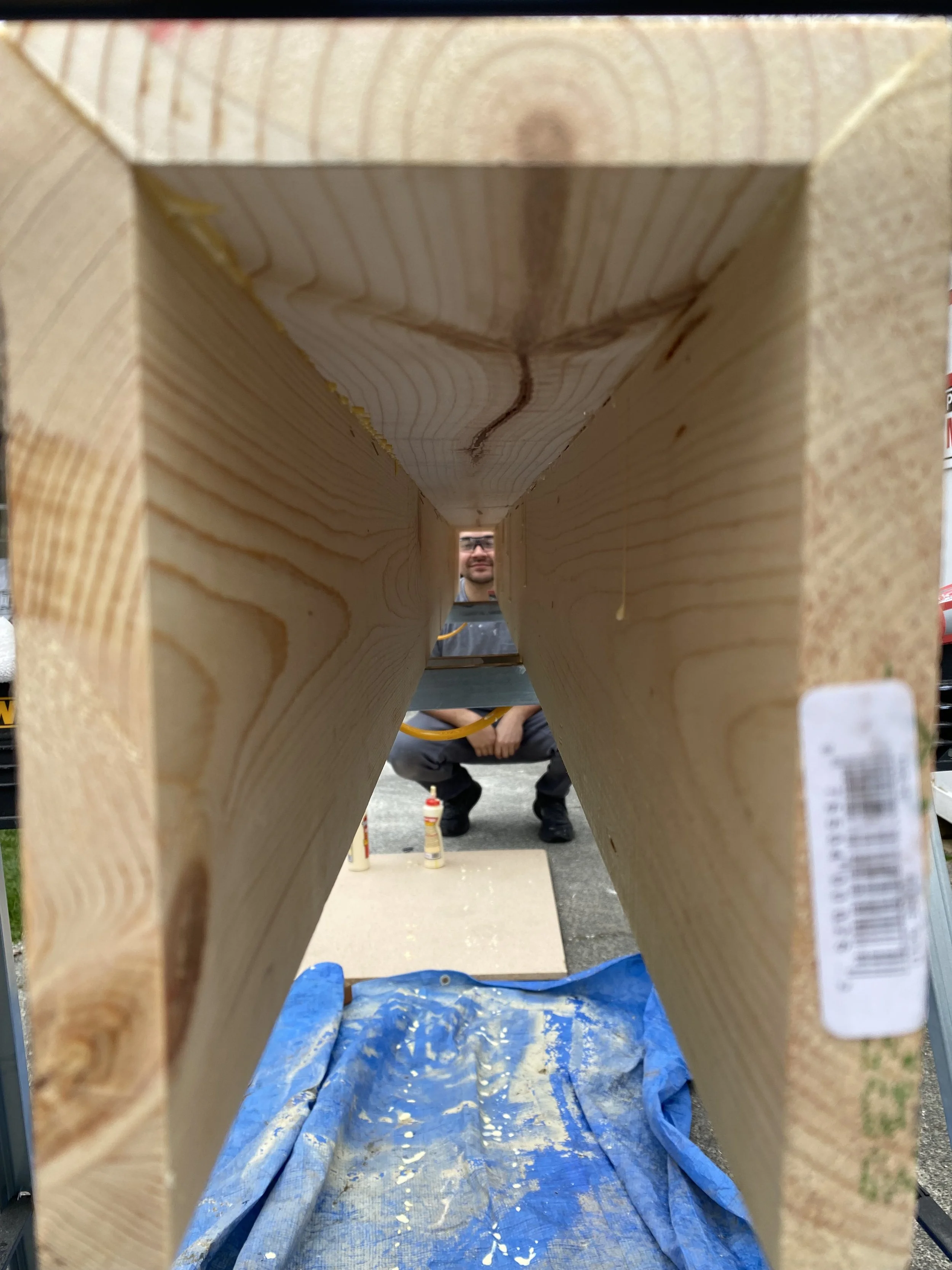 We put on a layer of blue tape on the edges to protect our beams, then glued two scrap wood pieces over the tape using a strong glue (one per side on the joining edge). This was secured to the beam using screws in the middle of the scrap pieces.