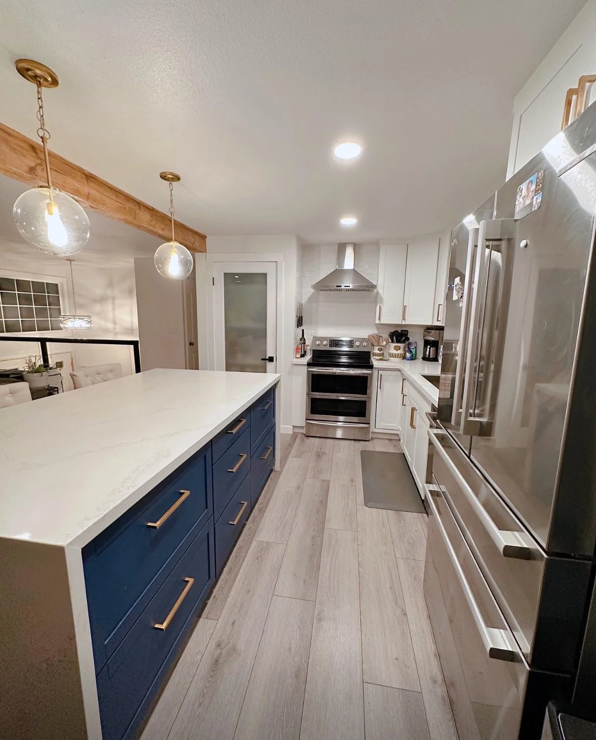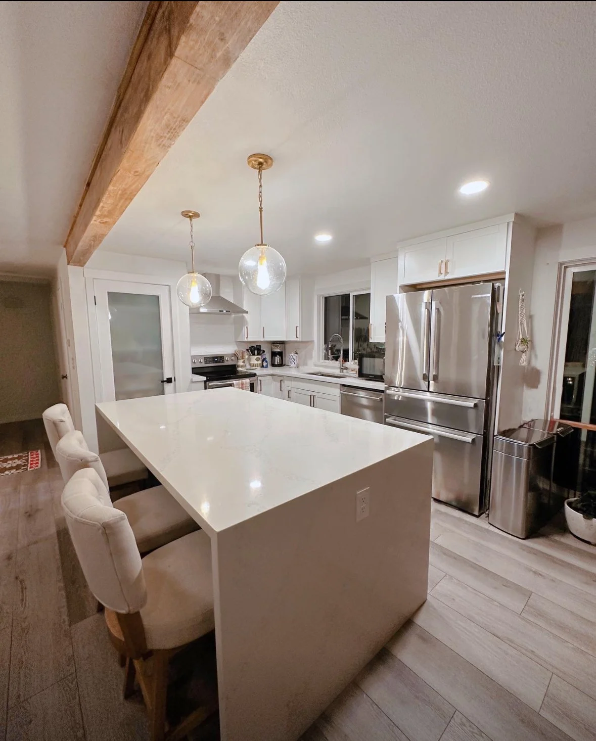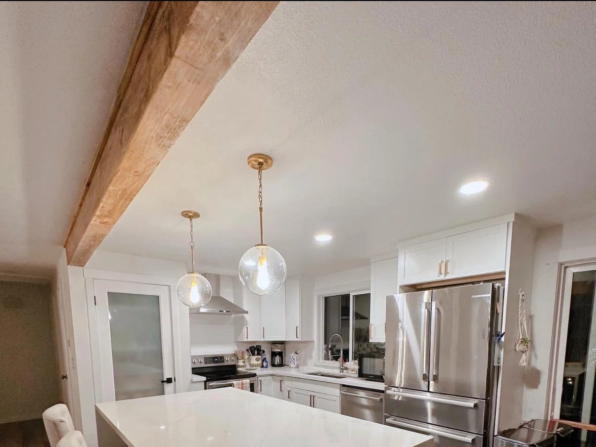 You can leave the beam natural, or apply a stain or whitewash depending on the style of your space. For that modern farmhouse feel, a light gray, weathered oak, or walnut stain pairs beautifully with white cabinetry and brass fixtures.